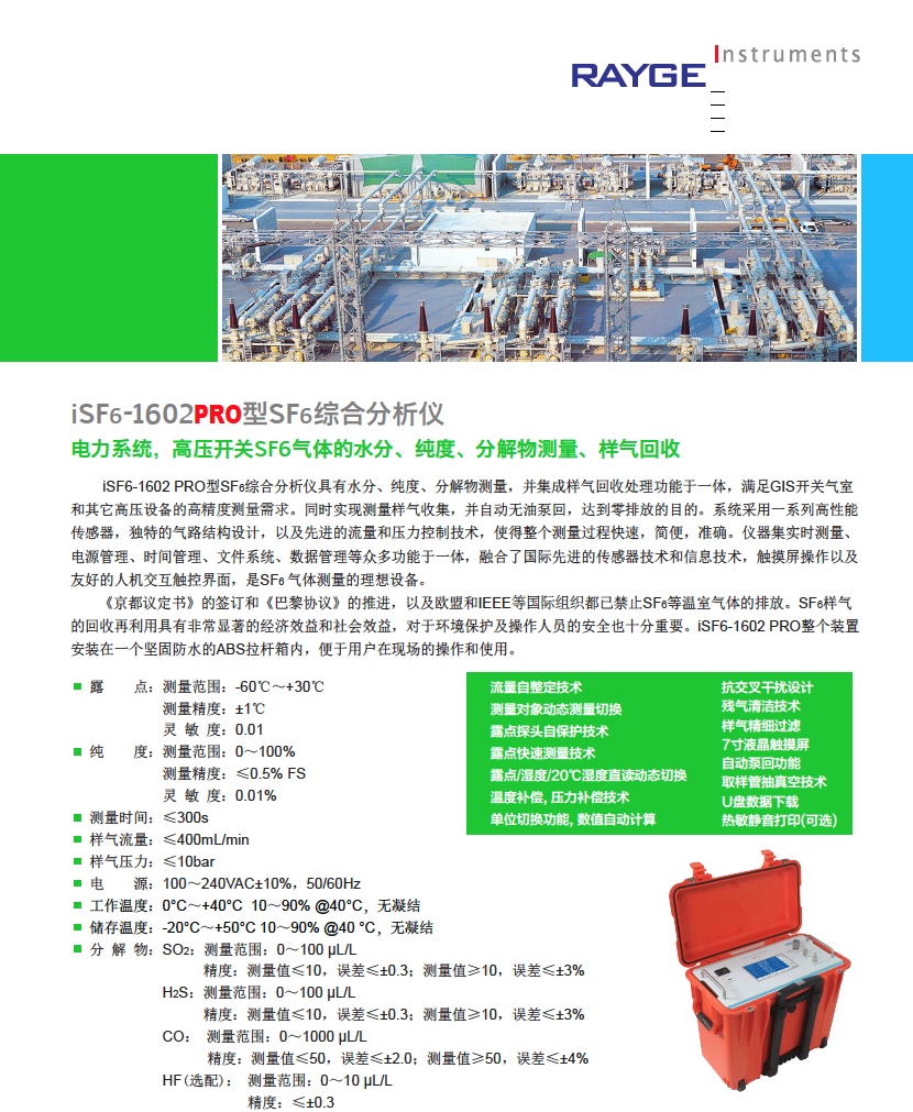 iSF6-1602 PRO型SF6 綜合分析儀具有水分、純度、分解物測量,并集成樣氣回收處理功能于一體,滿足GIS開關(guān)氣室和其它高壓設(shè)備的高精度測量需求。同時實(shí)現(xiàn)測量樣氣收集,并自動無油泵回,達(dá)到零排放的目的。
