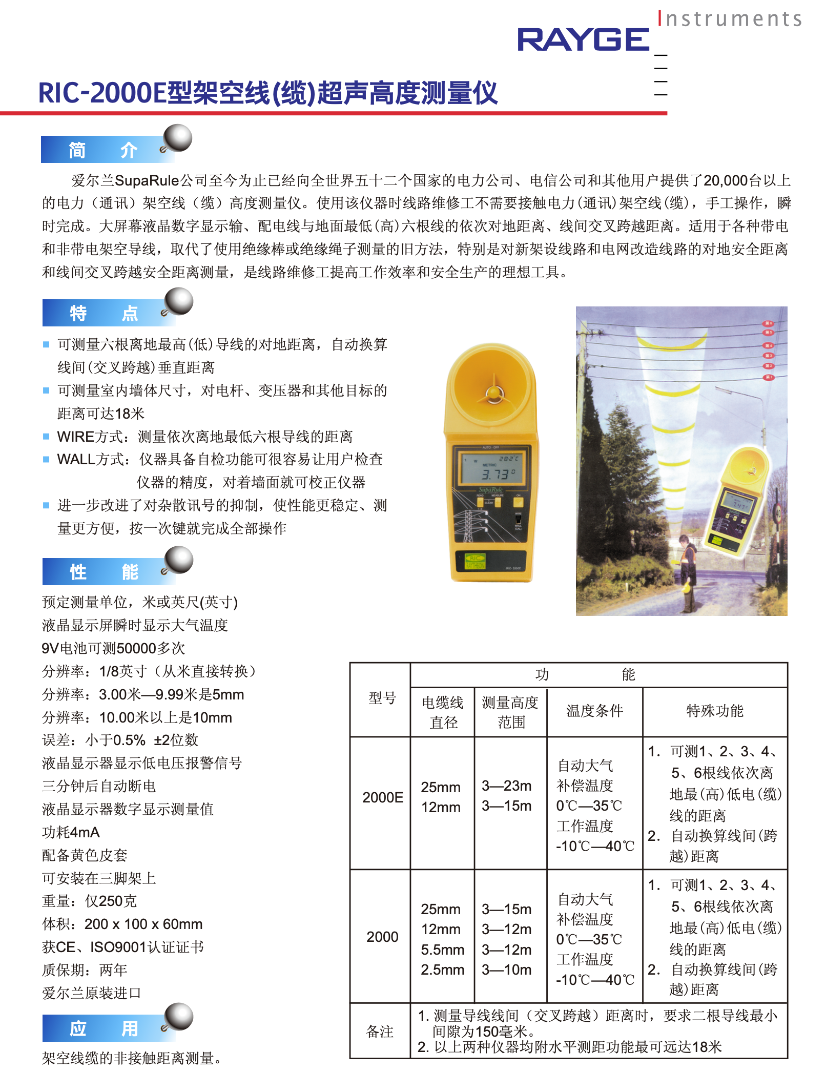 愛爾蘭SupaRule公司至今為止已經(jīng)向全世界五十二個國家的電力公司、電信公司和其他用戶提供了30,000臺以上的電力(通訊)架空線(纜)高度測量儀。使用該儀器時線路維修工不需要接觸電力(通訊)架空線(纜),手工操作,瞬時完成。適用于各種帶電和非帶電架空導(dǎo)線,取代了使用絕緣棒或絕緣繩子測量的舊方法,特別是對新架設(shè)線路和電網(wǎng)改造線路的對地安全距離和線間交叉跨越安全距離測量,是線路維修工提高工作效率和安全生產(chǎn)的理想工具。