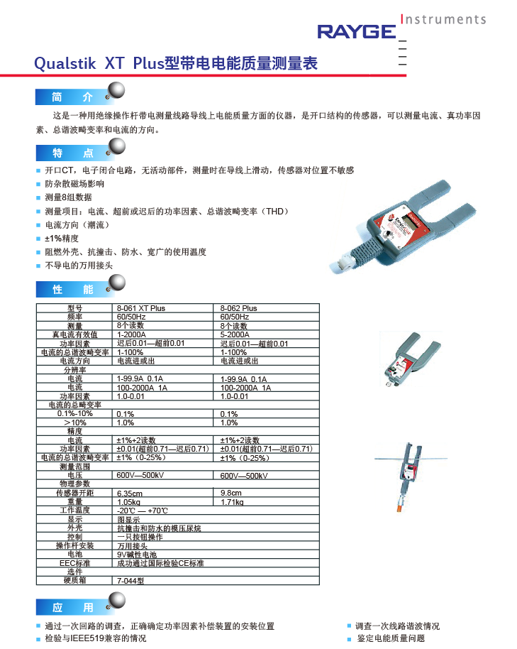 這是一種用絕緣操作桿帶電測量線路導線上電能質(zhì)量方面的儀器,是開口結構的傳感器,可以測量電流、真功率因素、總諧波畸變率和電流的方向。
