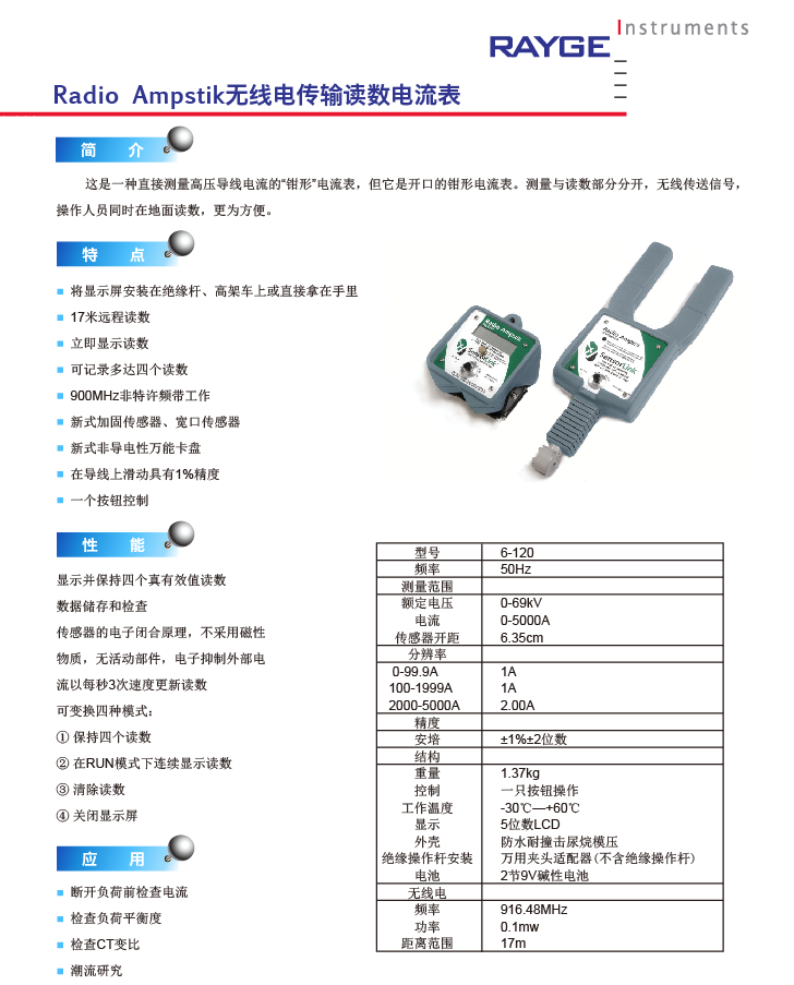 這是一種直接測(cè)量高壓導(dǎo)線電流的“鉗形”電流表,但它是開(kāi)口的鉗形電流表。測(cè)量與讀數(shù)部分分開(kāi),無(wú)線傳送信號(hào),操作人員同時(shí)在地面讀數(shù),更為方便。