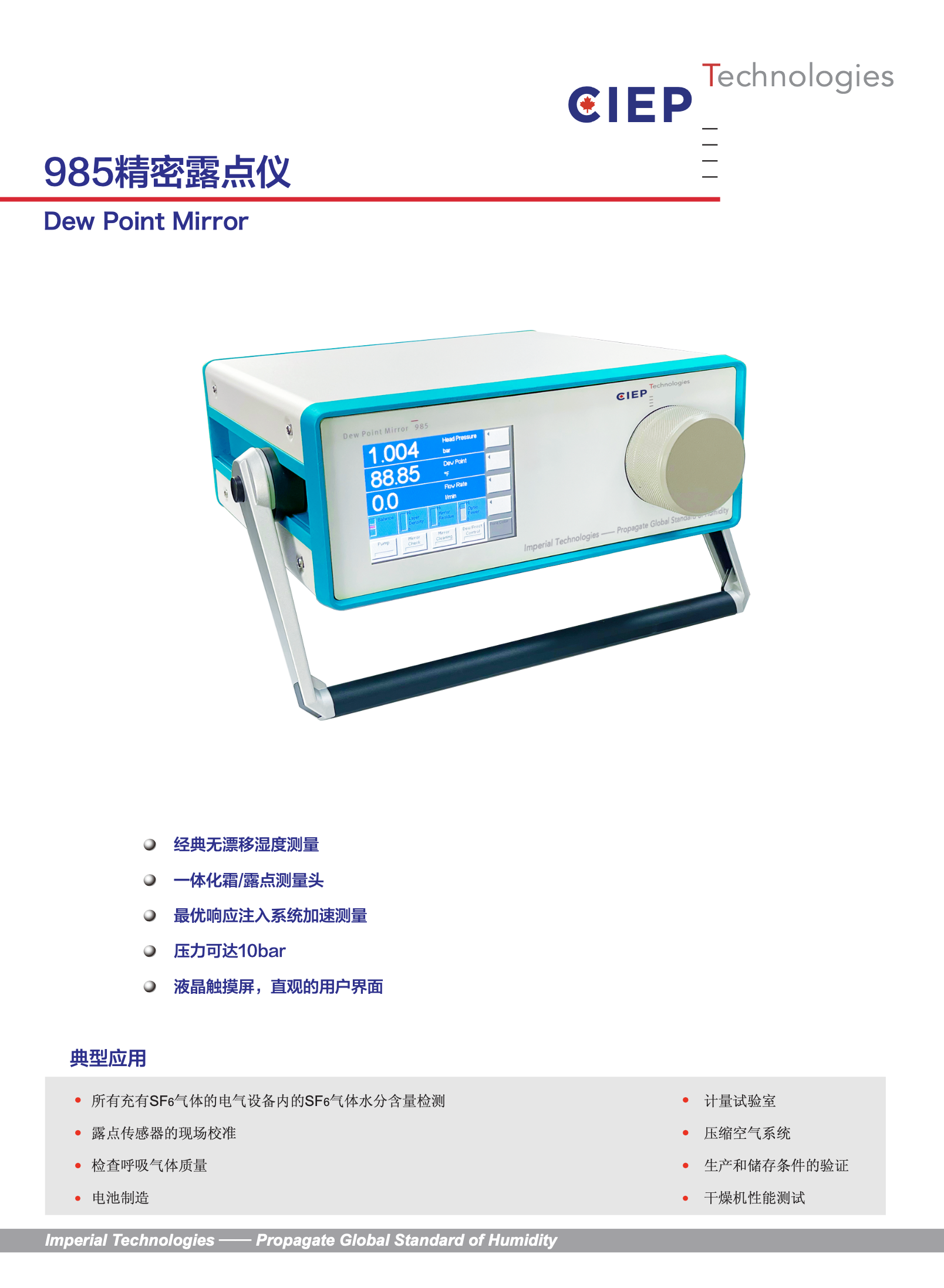 985精密露點儀是一種便攜式儀器,配有一體化測量頭,可對空氣和氣體中的霜露點和溫度進行現(xiàn)場和連續(xù)測量?;诶溏R原理,985提供了經(jīng)典,無漂移和精確的濕度測量方法。