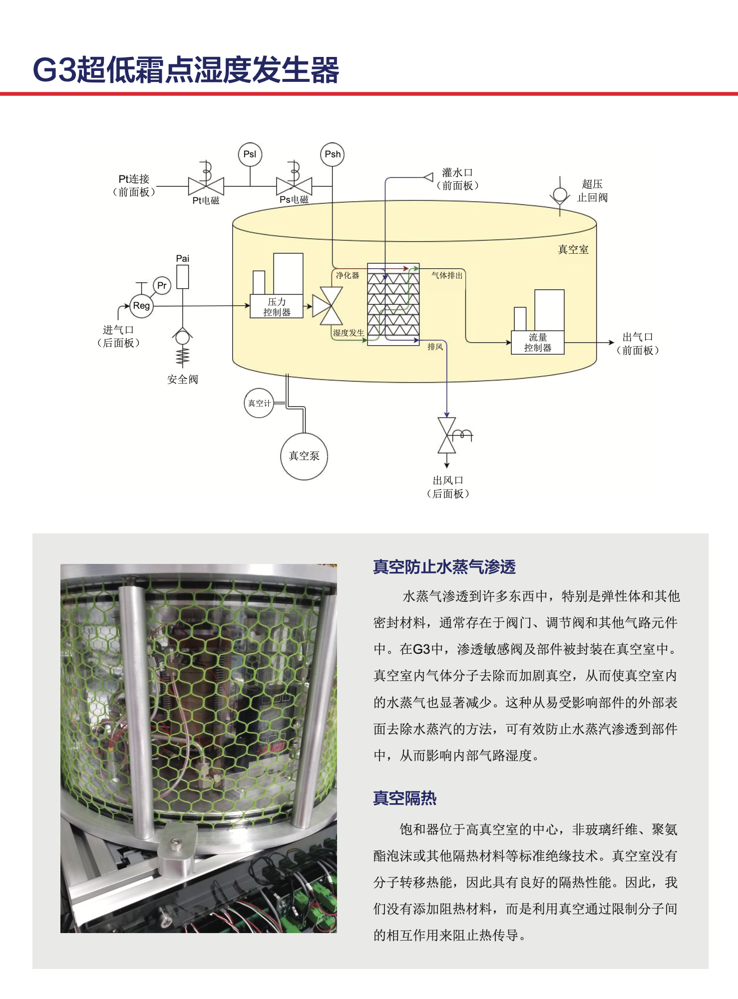 混合雙溫雙壓濕度發(fā)生器結(jié)合了經(jīng)NIST認(rèn)證的雙壓雙溫濕度產(chǎn)生原理的特點(diǎn)。本濕度發(fā)生器利用該原理,在給定的飽和溫度下,相對(duì)于水的液相或固相,高壓下的氣流為飽和。飽和溫度是決定載氣摻水量的主要因素。飽和器內(nèi)的壓力是決定混合氣載氣量的主要因素。離開飽和器后,加濕氣流(由水蒸氣和載氣混合而成)膨脹到較低的壓力,并在使用時(shí)加熱到一定溫度,例如被測設(shè)備(DUT)。然后,測量飽和器內(nèi)的壓力和溫度,以及膨脹后的壓力和溫度(通常在被測設(shè)備DUT),用來確定產(chǎn)生的氣流濕度含量。然后通過調(diào)節(jié)飽和器內(nèi)的溫度和壓力來精確控制濕度。
