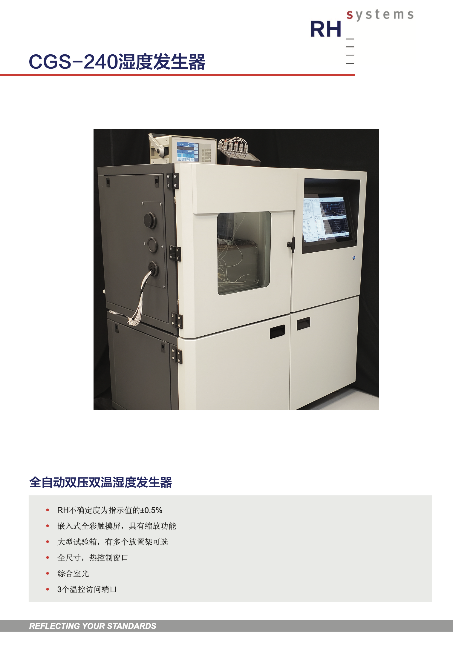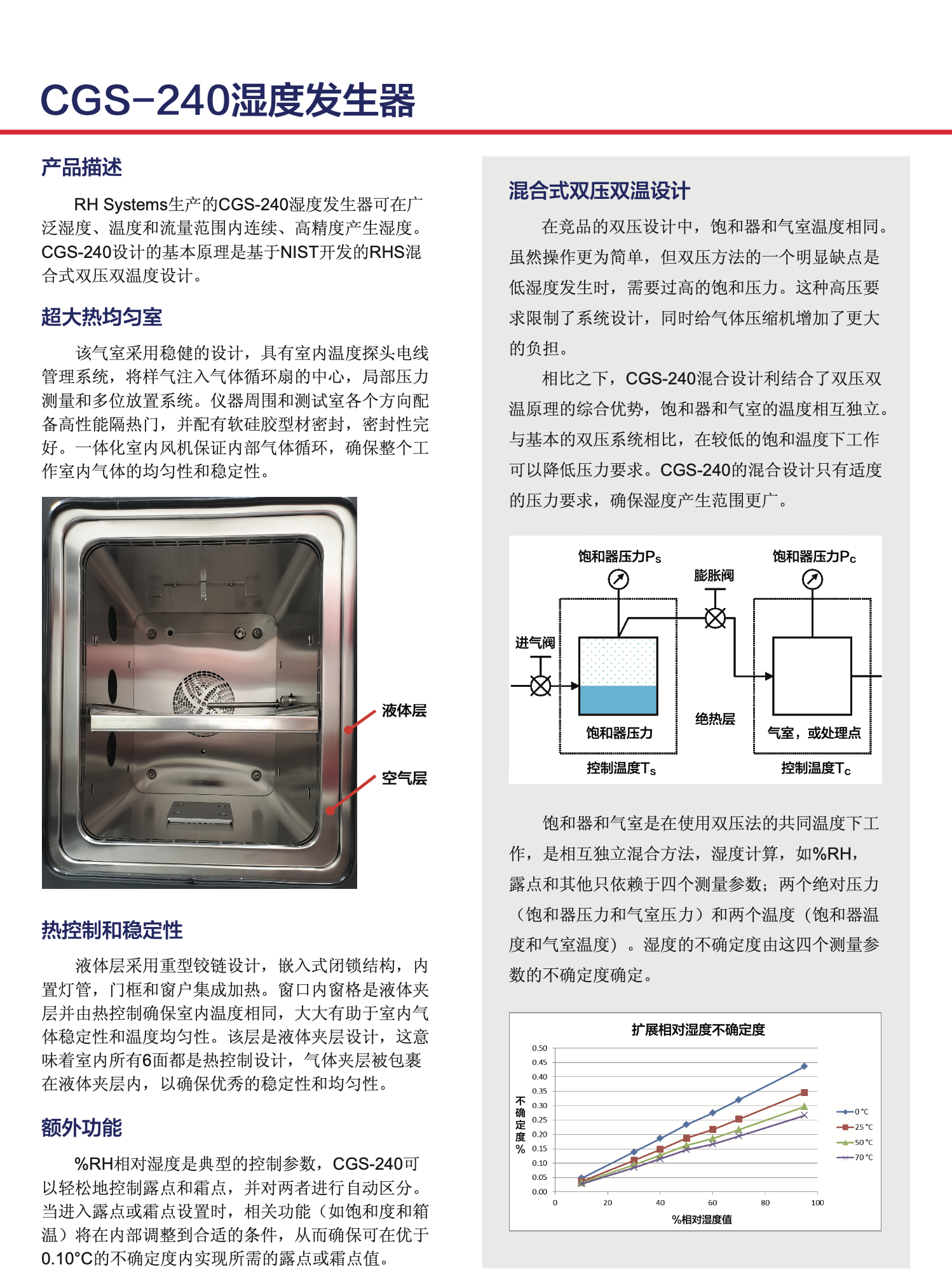 RH Systems生產(chǎn)的CGS-240濕度發(fā)生器可在廣 泛濕度、溫度和流量范圍內(nèi)連續(xù)、高精度產(chǎn)生濕度。 CGS-240設(shè)計(jì)的基本原理是基于NIST開發(fā)的RHS混 合式雙壓雙溫度設(shè)計(jì)。