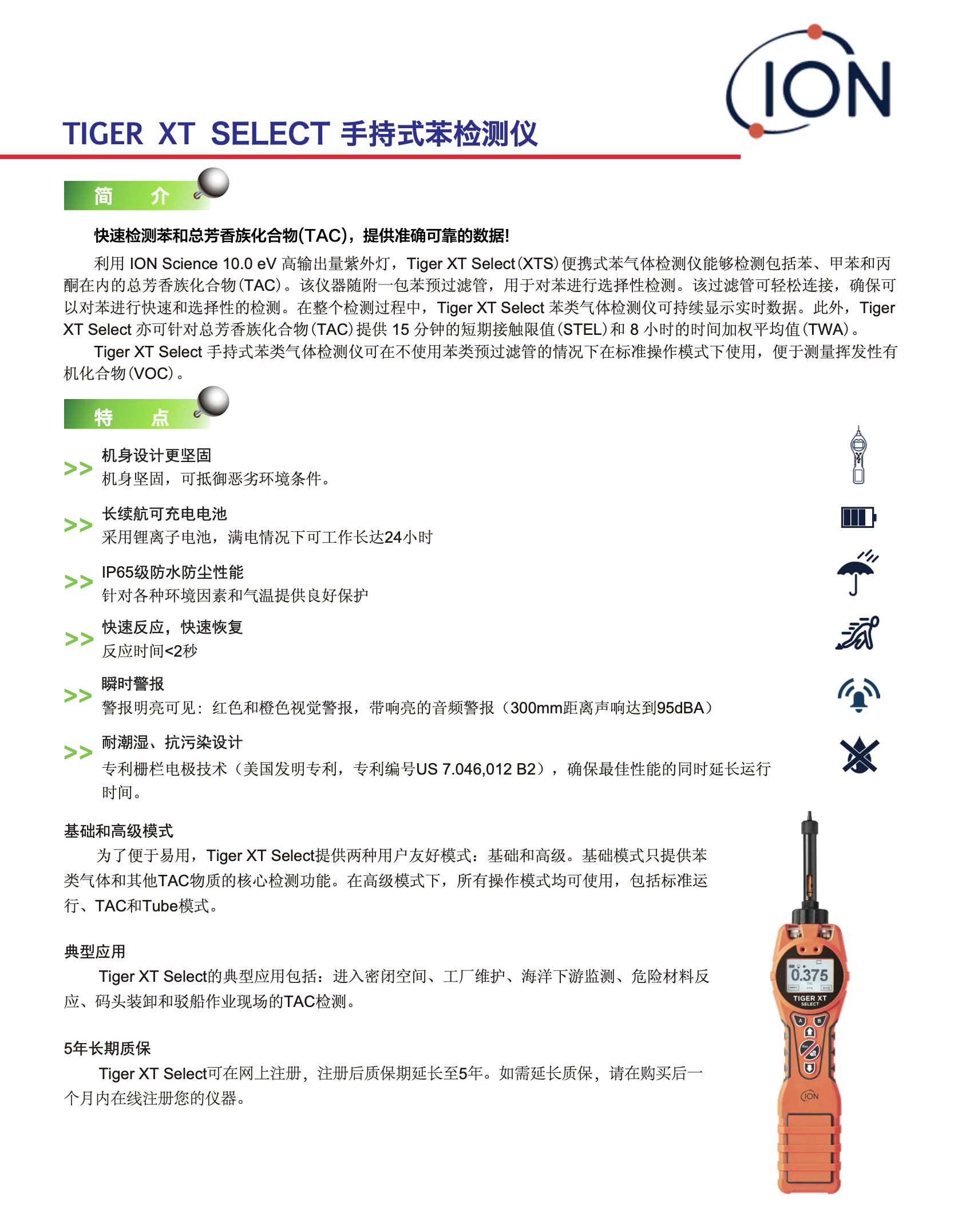 利用 1ON Science 10.0eV 高輸出量紫外燈,Tiger XT Select (XTS) 便攜式苯氣體檢測儀 能夠檢測包括苯、甲苯和丙酮在內(nèi)的總芳香族化合物(TAC)。