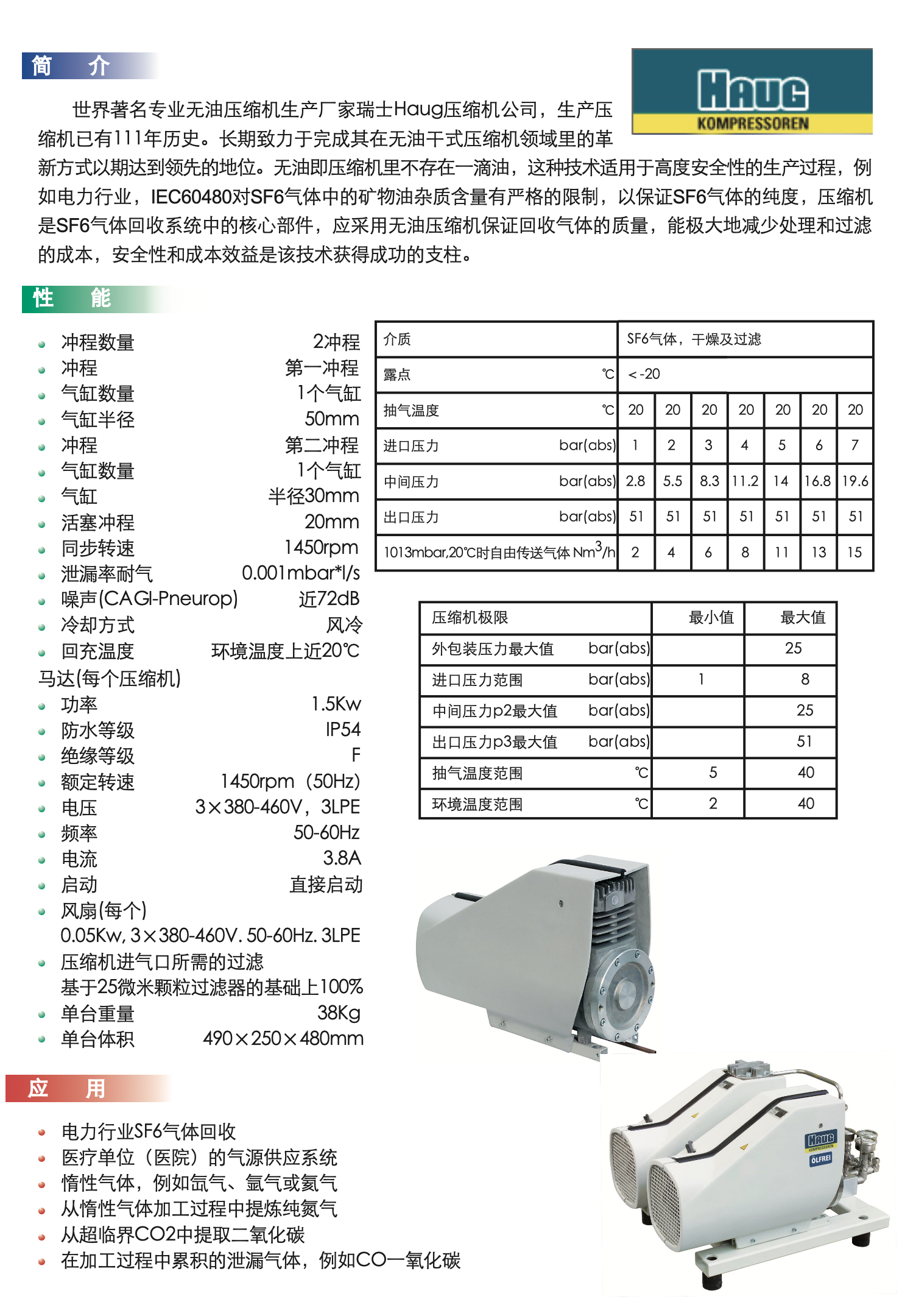 世界著名專業(yè)無油壓縮機(jī)生產(chǎn)廠家瑞士Haug壓縮機(jī)公司,長期致力于完成其在無油干式壓縮機(jī)領(lǐng)域里的革新方式以期達(dá)到領(lǐng)先的地位,以保證SF6氣體的純度,壓縮機(jī)是SF6氣體回收系統(tǒng)中的核心部件,應(yīng)采用無油壓縮機(jī)保證回收氣體的質(zhì)量,能極大地減少處理和過濾的成本,安全性和成本效益是該技術(shù)獲得成功的支柱。